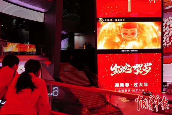 2月13日晚,中国电影博物馆,两名姑娘在观看《哪吒之魔童闹海》介绍片。统计数据显示,当日,该片票房(含预售)超过100亿元,成为我国影史首部百亿元票房影片。