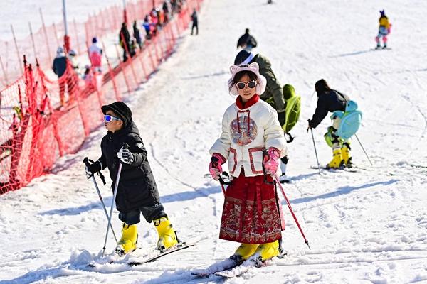 2月16日,山东省潍坊市,小朋友在青州市一处滑雪场练习滑雪。视觉中国供图