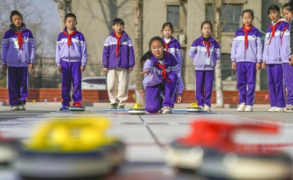 2月25日,河北省遵化市第三实验小学的学生在大课间掷冰壶。近年来,河北省遵化市中小学充分利用大课间时间,组织学生开展篮球、轮滑、冰壶、足球等体育活动,让学生在运动中提升体能,促进健康成长。刘满仓/摄(新华社发)