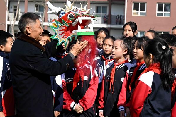 2月26日,王彦州在石家庄市草场街小学给孩子们讲解“龙”风筝制作技艺。“二月二”临近,河北省石家庄市风筝制作民间艺人王彦州正忙着制作“龙”风筝。近年来,王彦州作为当地中小学的校外辅导员,把风筝文化和制作技艺带进校园,让更多孩子感受中国传统文化魅力。陈其保/摄(新华社发)