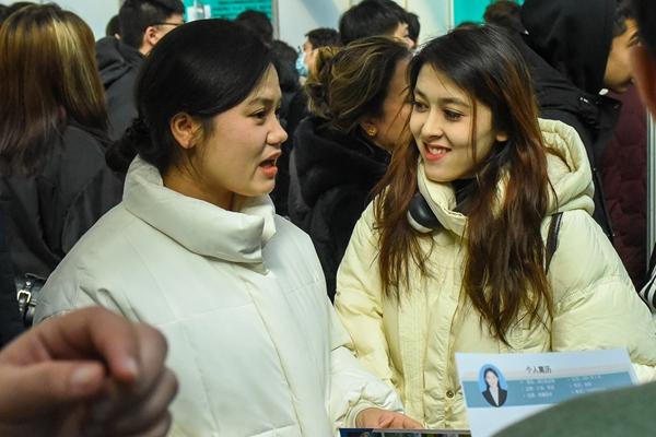 3月2日,在乌鲁木齐市新疆国际会展中心招聘会现场,求职者在分享就业信息。当日,新疆维吾尔自治区2025年高校毕业生春季招聘会在乌鲁木齐市新疆国际会展中心举办。新华社记者 高晗/摄