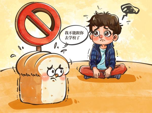 近日,广东湛江某高中“不许学生带面包入校”引发热议。学校原意是限制不健康食品,却连面包也“一刀切”,目前学校已发布公告,就此事道歉。学校担忧食品安全和管理困难,但应考虑学生生长发育需求,采取更灵活措施,如制订禁带食品“黑名单”,允许带少量预包装食品,以保障学生的正当需求。漫画:程璨
