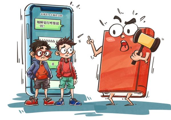 微信群不是法外之地。江苏连云港的6名中学生建群辱骂同学,制作丑化表情包,法院认定构成名誉侵权。“未成年”不是“护身符”,校园欺凌不仅需加强法治教育,更需家庭、学校与社会联手,明确网络言行边界,引导学生从小树立权利意识,防止“小打小闹”演变为严重侵权。漫画:程璨