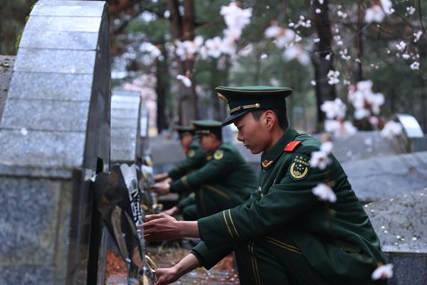 4月4日,武警第二机动总队某支队官兵在西藏波密烈士陵园向解放西藏和修筑川藏公路牺牲的英烈们敬献鲜花。清明节前,全军各部队组织官兵开展祭扫英烈活动,以多种形式缅怀先烈、铭记历史,砥砺强军之志,担当强军重任。 陆文凯/摄(新华社发)