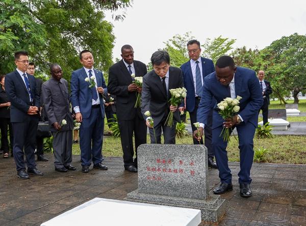 4月2日,来宾在坦桑尼亚达累斯萨拉姆西郊的中国专家公墓献花。 中国驻坦桑尼亚大使馆、坦政府代表和各界友人、在坦中资机构、华侨华人代表等100余人日前来到坦首都达累斯萨拉姆西郊的中国专家公墓祭扫,共同缅怀为坦赞铁路建设奉献生命的中国专家。赫尔曼·埃马纽埃尔/摄(新华社发)