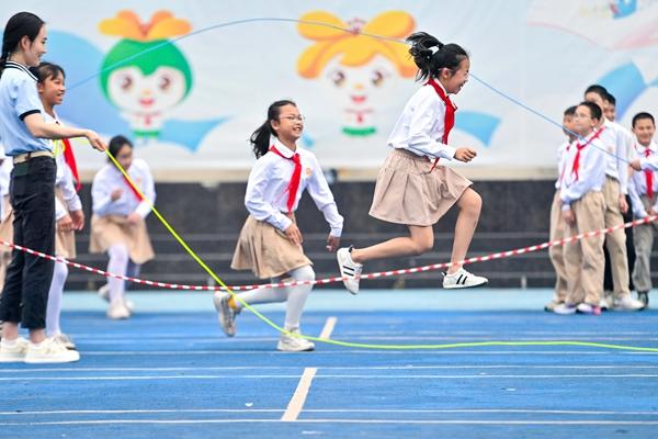 4月10日,学生们在大课间跳绳。 春日里,广西柳州市潭中路第二小学总部积极开展丰富多彩的阳光体育大课间活动,将啦啦操、武术操、跳绳、趣味游戏等项目融入体育运动中,提高学生身体素质,让孩子们在紫荆花盛开的校园里,快乐运动,健康成长。新华社记者 黄孝邦/摄