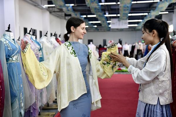 参加曹县汉服文化节的俄罗斯嘉宾娜斯佳(左)在曹县有爱云仓汉服基地试穿汉服(4月8日摄)。山东省菏泽市曹县依托电商资源优势,聚力发展汉服产业,形成了涵盖原创研发、设计制作、裁剪打版、绣花印花、展演销售的完整产业链条。如今,汉服产业已成为当地群众增收、乡村振兴的引擎,吸引了近2万名大学生返乡就业、创业。新华社记者 郭绪雷/摄