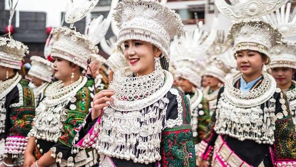 4月12日,当地少数民族群众参加庆祝活动。当日,在贵州省黔东南苗族侗族自治州台江县,万余名苗族群众身着盛装,庆祝一年一度的姊妹节。“苗族姊妹节”是贵州台江县苗族同胞的传统节日,2006年被列入第一批国家级非物质文化遗产名录。 新华社记者 陶亮/摄