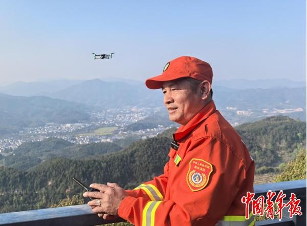 走过298级石阶,李发祥登上了赖坊村“云上境”瞭望平台,这里海拔900多米。李发祥向远处望去,周边村庄的情况一览无遗。他介绍,这里的瞭望平台会与无人机巡查监控高效配合,在高森林火险期和重要时段,严格按照专项值班制度运行。“发布橙色预警或禁火令的时候,我们就会专门安排人员到瞭望平台值班。如果只靠装监控,那涉及的范围其实很窄,而且费用高,清晰度也不能保证。”