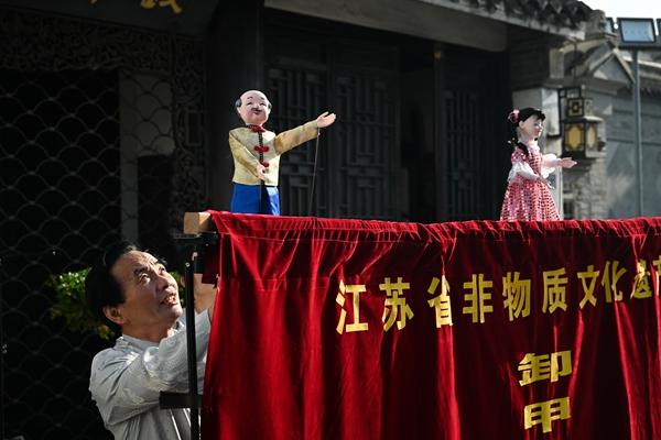 4月27日,艺人在表演卸甲肩担木偶戏。当日,在江苏省高邮市运河·盂城驿街区,木偶戏、挑花担、撂石锁等非遗项目表演吸引众多游人驻足观看。 近年来,运河·盂城驿街区积极组织非遗进景区,促进当地优秀传统文化传承和发展,推动非遗更好融入百姓生活。新华社记者 季春鹏/摄