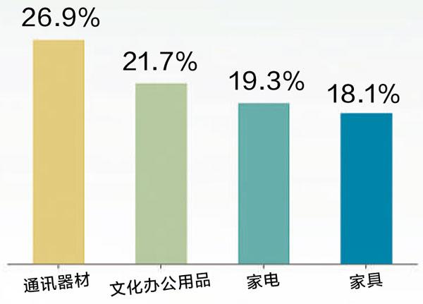 2025年一季度,通讯器材、文化办公用品、家电、家具零售额同比分别增长26.9%、21.7%、19.3%和18.1%