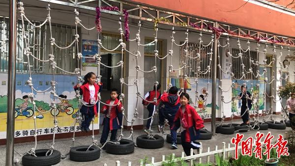 他说,那就想办法把学校变得好玩。新州二小的游乐设施越来越多:二楼护栏锯开口子,两侧各装了一个滑梯;二楼吊下两张攀爬网,学生们荡秋千、爬网子;一楼的一整面墙做成了攀岩墙,下面铺上保护垫。