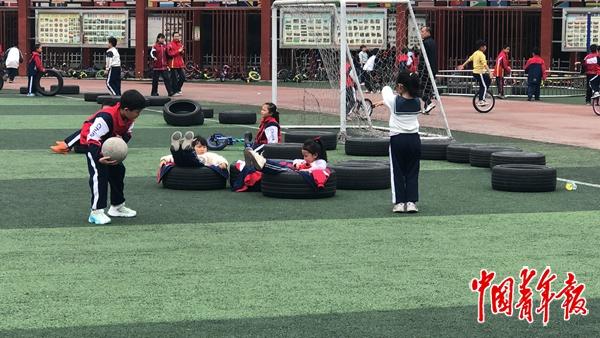 足球场上堆着几百个轮胎,这是老师、家长和汽修店捐的。一开始只放了几个,不够学生玩,一直增加到现在的四五百个。