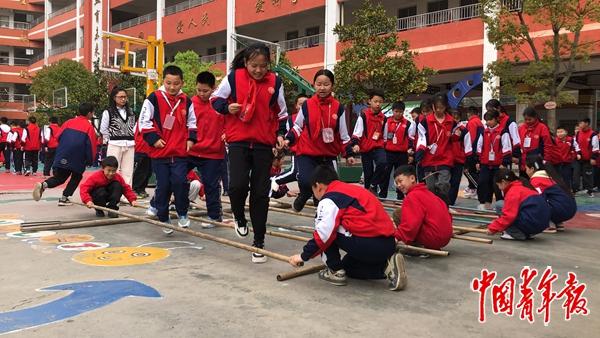 篮球场的4个角落里都放着竹竿,经过日晒雨淋已经褪色,竹竿撞击的清脆节奏响起——五年级的学生开始跳竹竿舞了。