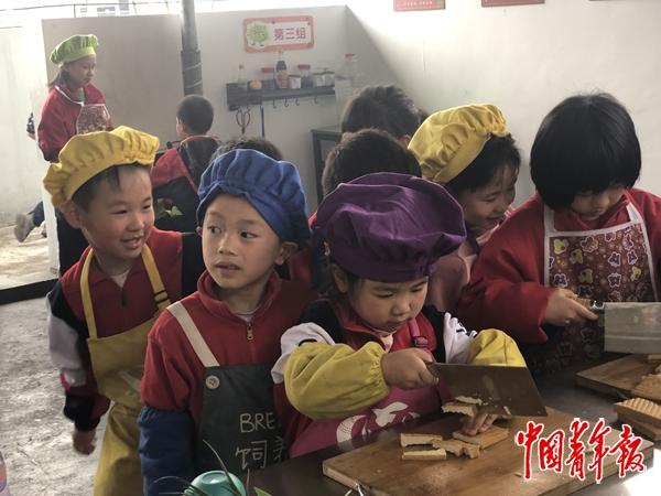记者到的这天,轮到一年级某班,孩子们戴着彩色厨师帽、穿着围裙,在菜板前排着队准备切豆干、小葱。