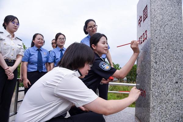 在五四青年节来临之际,广西崇左市爱店边检站联合宁明县人民检察院、爱店海关共同举办“青春耀国门 建功新时代”青年节主题系列活动。 活动当天,青年代表参观爱店口岸联检楼执勤现场,了解边检勤务改革、深化警企共管机制、服务保障顺畅通关的举措和成绩。在1223号界碑,大家共同为界碑描红,并聆听界碑经纬度、编号含义等知识。图为青年民警职工代表为界碑描红。苏畅/摄