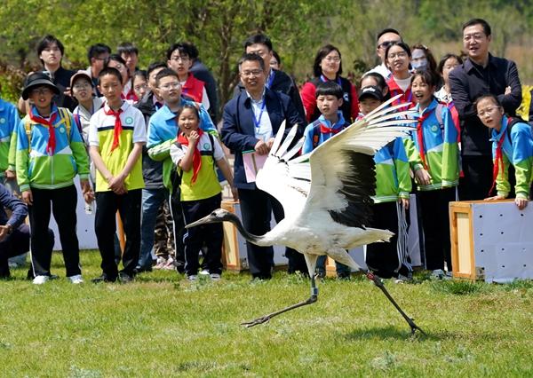 5月10日,志愿者在河北省秦皇岛市北戴河湿地放飞一只丹顶鹤。当日,由河北省林业和草原局主办的2025年京津冀晋爱鸟、护鸟、观鸟活动暨第四届北戴河观鸟季活动在河北省秦皇岛市北戴河湿地启动。启动活动现场先后放飞了丹顶鹤、东方白鹳、秃鹫、雕鸮、红隼等28只国家一、二级保护鸟类。 新华社记者 杨世尧/摄
