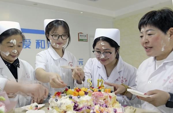5月12日,在河南省商丘市夏邑县太平镇康平中医院,护士在分享节日蛋糕。 5月12日是国际护士节。今年护士节的主题为“关爱护士队伍,守护人民健康”。