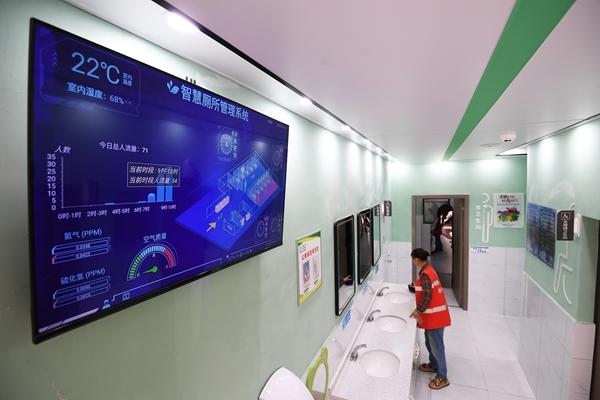 5月9日,贵阳,智慧厕所管理系统和智能监测系统对空气质量指标实时监测。一旦指标超标,香氛系统将自动启动,及时改善空气质量。视觉中国供图