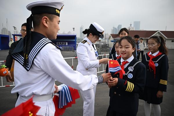 4月22日,成都5所学校的近40名学生走进成都舰,开启思政语文课课堂。视觉中国供图