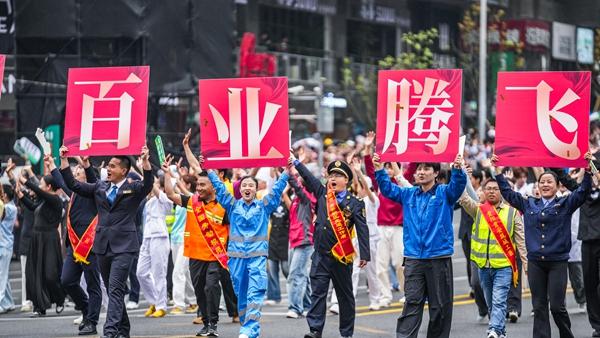 5月18日,奋斗之光方阵的表演队伍在进行巡游。当日,贵州民族团结大巡游活动在贵州省贵阳市举行。来自贵州省9个市(州)的3600余人组成26个特色方阵,集中展示贵州的民族文化和时代风尚。新华社记者 陶亮/摄