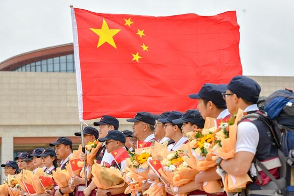 5月18日,中国政府援缅卫生防疫队队员在昆明长水国际机场参加欢迎仪式。当日12时许,中国政府援缅卫生防疫队在圆满完成震后防疫援助任务后,乘机抵达昆明长水国际机场。缅甸7.9级地震发生后,中国政府援缅卫生防疫队于4月19日出发,赴重灾区曼德勒省开展为期1个月的灾后卫生防疫工作。彭奕凯/摄(新华社发)