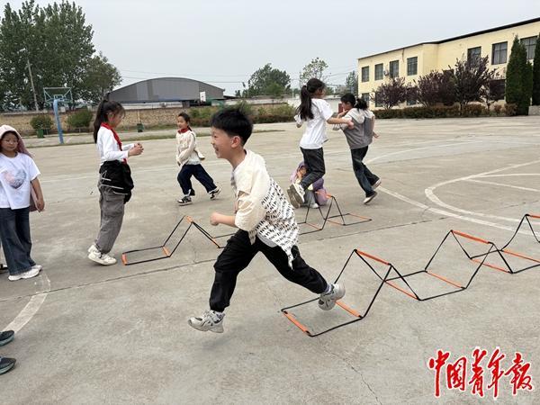 几个小学二年级孩子,把一种可折叠的敏捷梯玩出了花样。开始只是撑起一个格子跳,后来撑起两个、三个、四个,随着被撑起的格子不断增加,跳跃难度不断提高,孩子们一次又一次排着队,奔跑跳跃。