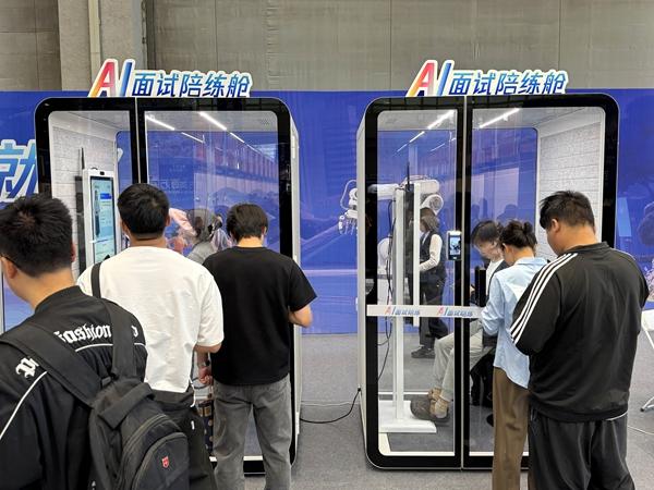近日,在南京举行的“百万英才汇南粤”招聘活动现场,AI面试陪练舱助力求职者拿到入职Offer。视觉中国供图