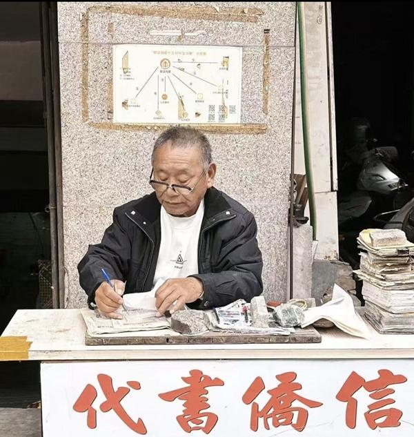 如今,他每天早上定时出摊,放5本字典、3块压书石、1张写字板,陪他数十年的老木桌去年塌了,换成了新的钢木桌,现在的摊位租金是每月300元。他旁边有一家土笋冻摊子,也和代书摊一样上了年纪。每天都有人来这条老街,找他闲聊,都是老朋友。