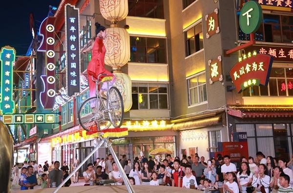6月15日,山东临沂,杂技演员在兰山区“灯火阑珊·新琅琊”不夜街区表演。视觉中国供图