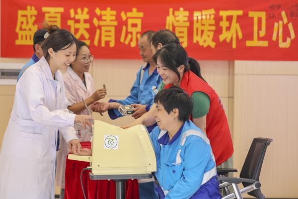 6月19日,福建福州,中医医生和志愿者在鼓楼区水部街道爱心驿站为环卫工人进行健康检测。谢贵明/视觉中国