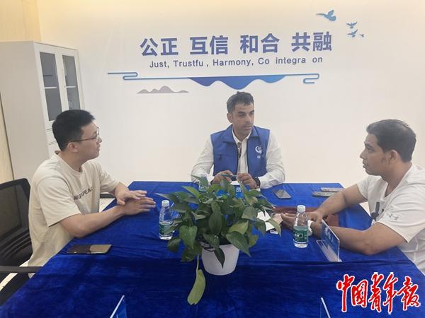 6月27日下午,在浙江省绍兴市柯桥区移民事务服务站一间“洋娘舅”调解室内,40岁的黎巴嫩商人李天明(中文名)穿着印有“洋娘舅调解员”字样的蓝色马甲,娴熟地用中英文进行调解工作。