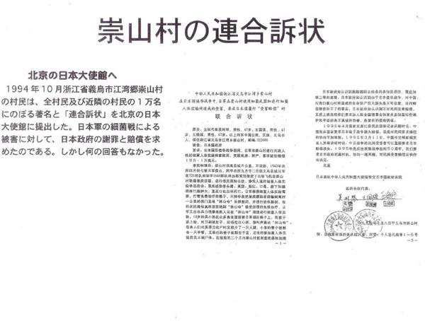 1994年10月,崇山村的村民吴利琴、王国强、王焕斌三人代表崇山村起草了《崇山村要求日本国履行细菌战受害赔偿的联合诉状》。