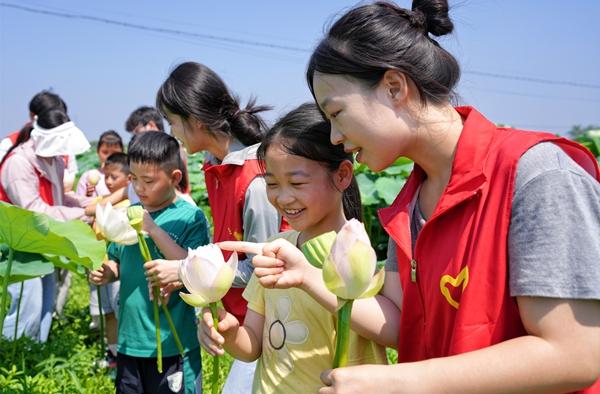 7月7日,在江苏省海安市墩头镇千步村,南京工业大学建筑学院大学生志愿者在浅水藕田边教小学生认识荷花和莲蓬。暑假期间,孩子们参加丰富多彩的活动,充实假期生活。周强/摄(新华社发)