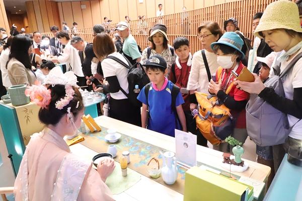 7月12日,人们在日本大阪世博会中国馆“浙江周”活动上观看宋代点茶展示。以“诗画浙江”为主题的2025年日本大阪世博会中国馆“浙江周”活动于12日正式拉开帷幕。中日两国政府和企业代表等约200人出席开幕式。新华社记者 李子越/摄