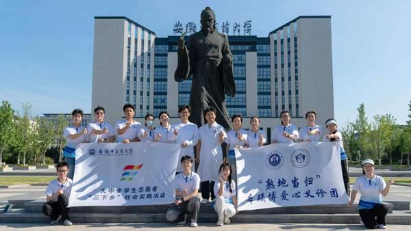 安徽中医药大学“熟地当归”本硕博爱心义诊团近日赴安徽省六安市舒城县中国行善者小镇,开展暑期“三下乡”社会实践活动。义诊活动现场,“熟地当归”本硕博爱心义诊团成员为当地居民提供针刺、艾灸、推拿、拔罐、耳穴贴敷等中医特色疗法服务。问诊台前,本硕博学子为居民把脉问诊、答疑解惑。在舒城县中医院工作的3名安徽中医药大学毕业校友助力现场义诊。齐亚军/摄影报道