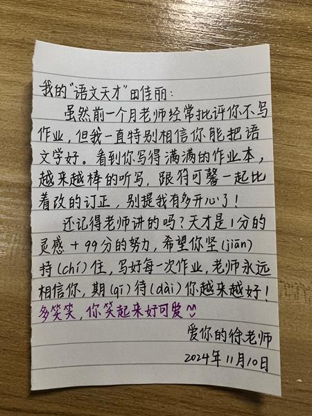 除了学业上的帮助,徐夕然更注重孩子们的心灵成长。班里有一个语文成绩一般的男孩小江。小江是一个留守儿童,性格内向,平时几乎不与人交流,在语文学习上也缺乏自信心,徐夕然一直想找机会鼓励他。