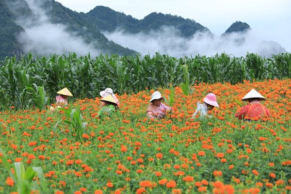 7月21日,云南腾冲市固东镇农民在凤凰山采收万寿菊。大暑将至,各地农民抢抓农时开展农业生产,田间地头一派繁忙的劳动景象。龚祖金/摄(新华社发)
