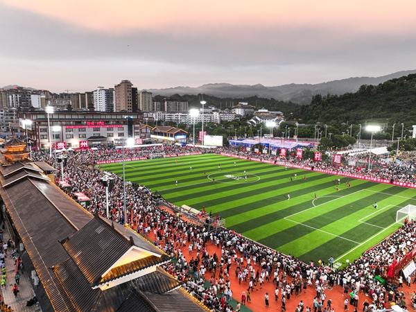 7月26日,人们在榕江“村超”球场观看球赛(无人机照片)。当日,贵州榕江举行主题为“感恩重启·贵州超力量”的超级星期六活动,球星巴乔、卡洛斯现场助阵,助力“村超”重燃赛事,正式回归。6月下旬,贵州榕江遭受特大洪水,贵州“村超”球场损失严重。经过约一个月的重建和准备,系列赛事和民俗展演陆续恢复。新华社记者 杨文斌/摄