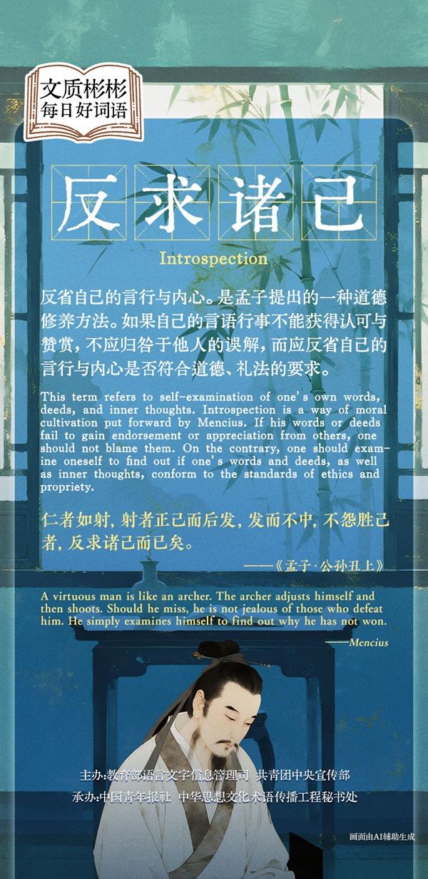 This term refers to self-examination of one’s own words, deeds, and inner thoughts. Introspection is a way of moral cultivation put forward by Mencius. Mencius inherited the Confucian belief that one’s moral integrity and meritorious deeds are determined by his own ethical cultivation. If his words or deeds fail to gain endorsement or appreciation from others, one should not blame them. On the contrary, one should examine himself to find out if his words and deeds as well as inner thoughts conform to standards of ethics and propriety.