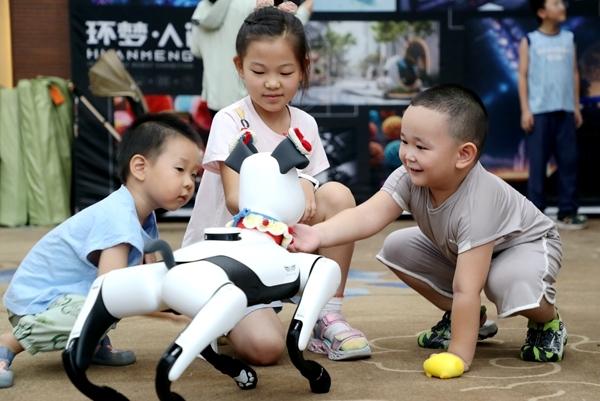8月3日,山东省东营市的小朋友在AI智能机器人科普展上与智能机器人互动。暑假期间,各地的小朋友通过丰富多彩的活动充实假期生活。