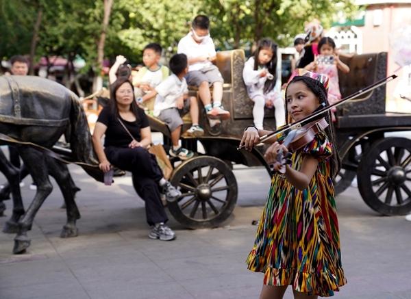 8月4日,在新疆伊犁哈萨克自治州伊宁市六星街,一名维吾尔族小女孩为游客演奏。进入暑期,新疆伊犁哈萨克自治州迎来旅游旺季,独特的自然风光和人文景观吸引大批游客。据伊犁州文旅部门统计数据显示,2025年1至7月,伊犁州累计接待国内游客5493.29万人次,同比增长10.31%。