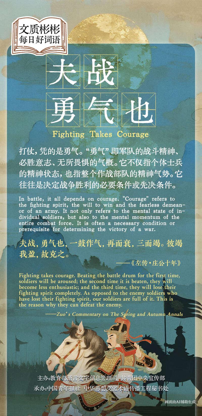 "Courage" is what it takes to go into a battle. It means the fighting spirit of an army, its will to win and its fearless heroism. The word "courage" not only refers to the spirit of individual soldiers, but also that of the entire army. It is a necessary condition or pre-requisite for winning the victory. Going into battle is dangerous. Without sufficient courage, other favorable conditions will hardly matter. What is implied is the following military wisdom: Of all the factors needed for a victory, the human factor is of primary importance; of all the human factors required, human spirit is of primary importance.