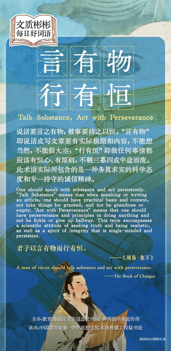 说话要言之有物,做事要持之以恒。“言有物”即说话或写文章要有实际根据和内容,语言、文字要与实际情况相符,不能想当然,不能假大空;“行有恒”即做任何事情都应该有恒心、有原则,说到做到,专心一意,坚持到底,不朝三暮四或半途而废。此术语实际所包含的是一种求真务实的科学态度和专一持守的诚信精神。