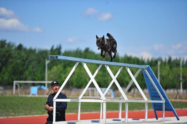 中青报·中青网记者在训练场看到了闫占江口中的9级跳台。前4节每节1.5米,后5节每节1.2米,总高12米。“实际工作中,可能并不会爬这么高。我们希望让它通过训练消除内心恐惧,在任何环境、任何场所,能听懂训导员的口令,完成各种任务。”刘琦道出了该科目训练的目的。