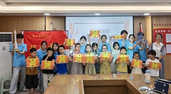 当天,滨湖世纪社区金翰居委会与合肥师范学院合作的“菜场娃娃”行知学堂暑托班正式结业。一个月内,每天早上9点至下午5点,来自合肥师范学院的学生志愿者在此开设行知文化、手工剪纸与绘画、物理科普小实验、航天知识科普等趣味课程,陪伴万国农贸市场商户的孩子过暑假。