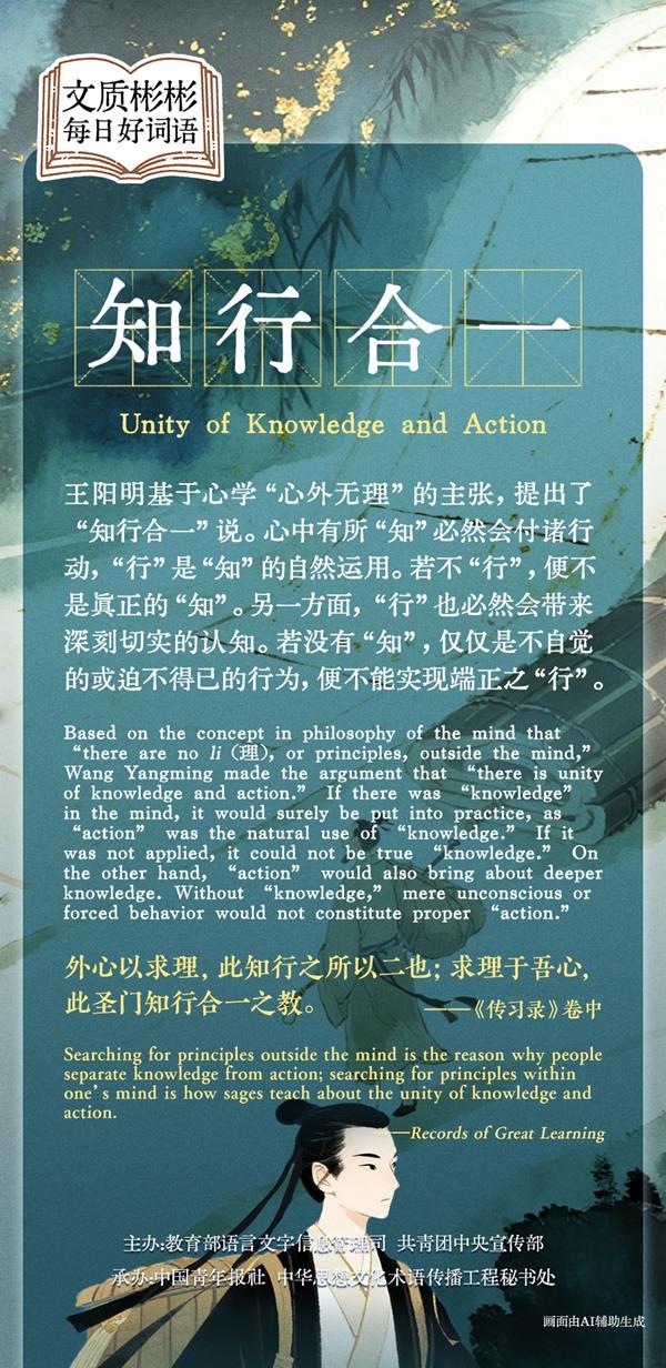 When knowledge is genuine and substantive, it becomes action; when actions bring about self-awareness and keen perceptions, they become knowledge. "Knowledge" and "action" were indivisible to begin with, and it was only because scholars later treated them as two separate things, contrary to their original nature, that there was a theory of their being united and developing together. (Records of Great Learning)