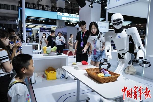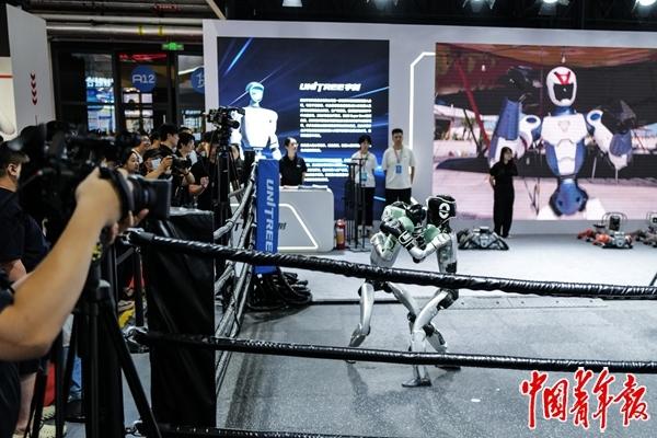 距离开幕式会场不远的展馆,已经成了机器人炫技的秀场。记者在展馆看到,“冠亚军机器人”所在的展位人头攒动,不少青少年观众拉着家长希望与机器人合影。例如,机器人格斗冠军宇树戴上拳套大显身手,2025RoboCup世界杯成人组和小型组冠亚军机器人加速进化,将展位变成了小型足球场,全球首个人形机器人半程马拉松冠军天工机器人展现英姿……