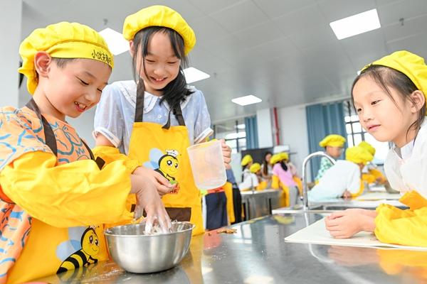 8月11日,湖北黄冈,在英山县综合素质教育示范基地,托管学生在劳动工坊做红豆沙面点。视觉中国供图