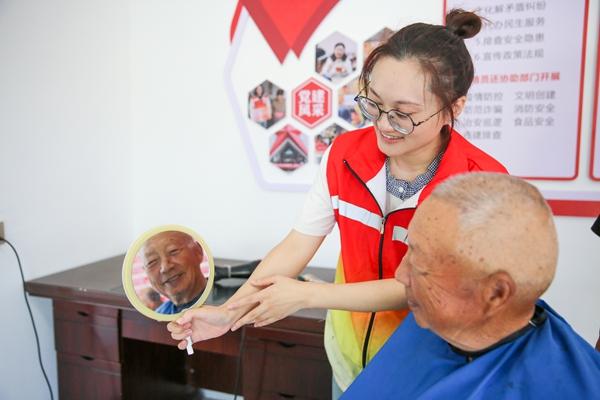10月10日,江苏南通,如皋市如城街道凌青村“你好·邻居”爱心驿站内,志愿者为80岁以上老人提供免费理发、推拿、测血压等志愿服务。这是如城街道今年推行的常态化助老项目,旨在通过村级爱心驿站破解养老难题,扩大养老服务覆盖范围,走出一条为民服务的新路子。徐慧/视觉中国